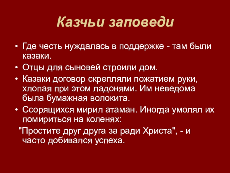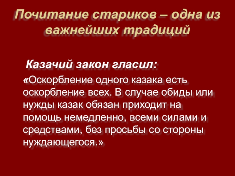«Оскорбление одного казака есть оскорбление всех. В случае обиды или нужды казак обязан приходит на помощь немедленно, всеми силами и средствами, без просьбы со стороны нуждающегося.»