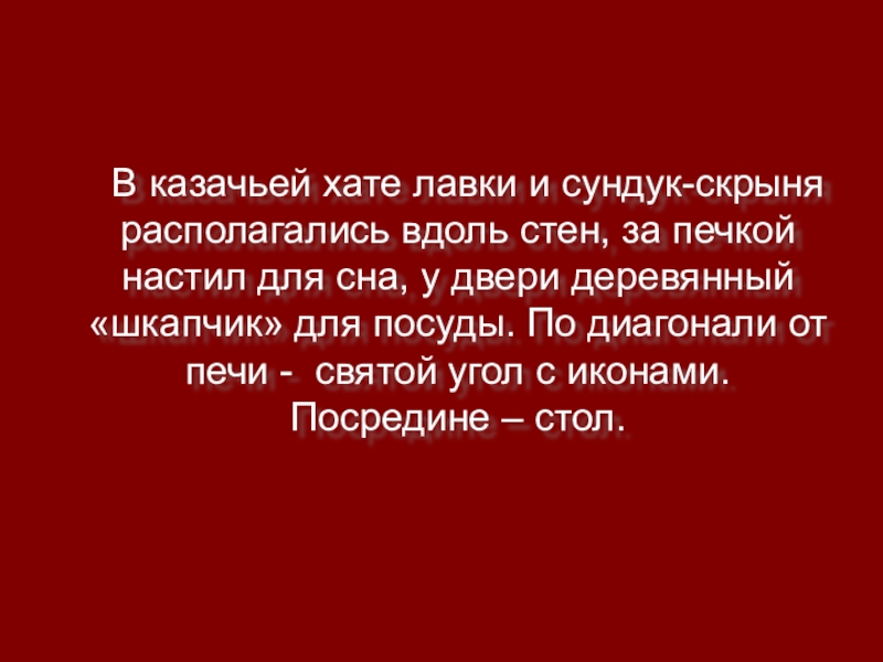 В казачьей хате лавки и сундук-скрыня располагались вдоль