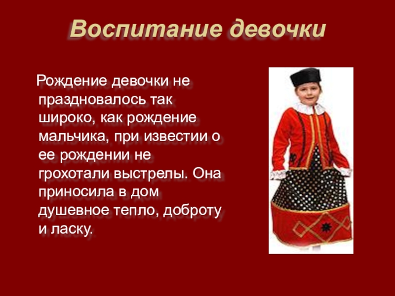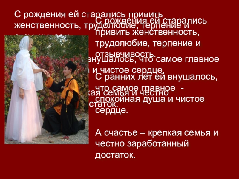 Слайд 16С рождения ей старались привить женственность, трудолюбие, терпение и отзывчивость.