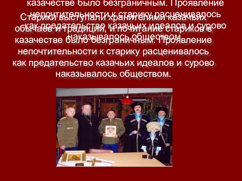 стариков в казачестве было безграничным. Проявление непочтительности к старику расценивалось как предательство казачьих идеалов и сурово наказывалось обществом.