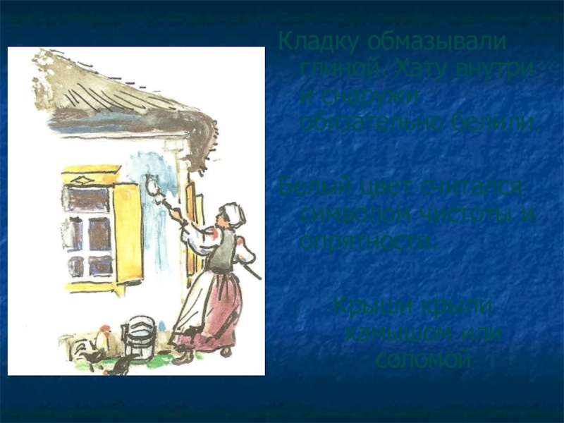 Слайд 10Кладку обмазывали глиной. Хату внутри и снаружи обязательно белили.