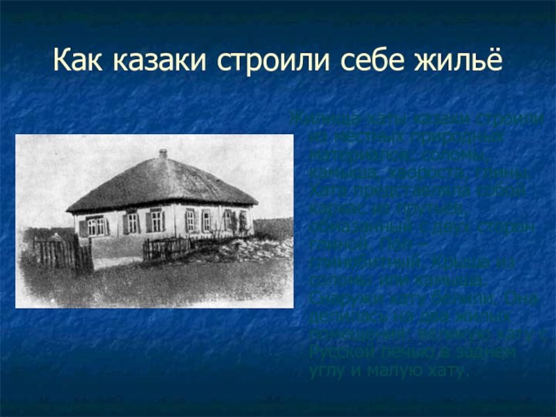Как казаки строили себе жильёЖилища-хаты казаки строили из местных природных материалов: соломы, камыша, хвороста, глины. Хата представляла