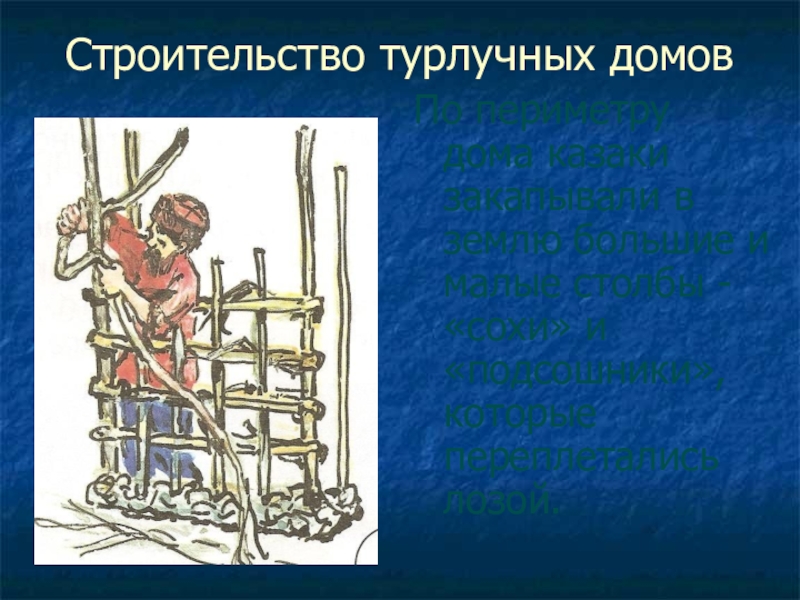 Строительство турлучных домовПо периметру дома казаки закапывали в землю большие и малые столбы - «сохи» и «подсошники»,