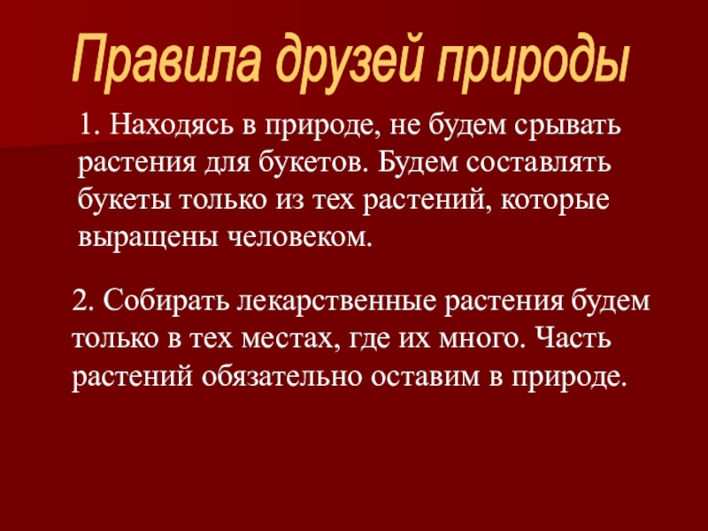 2. Собирать лекарственные растения будем только в тех местах, где их много. Часть растений обязательно оставим в природе.