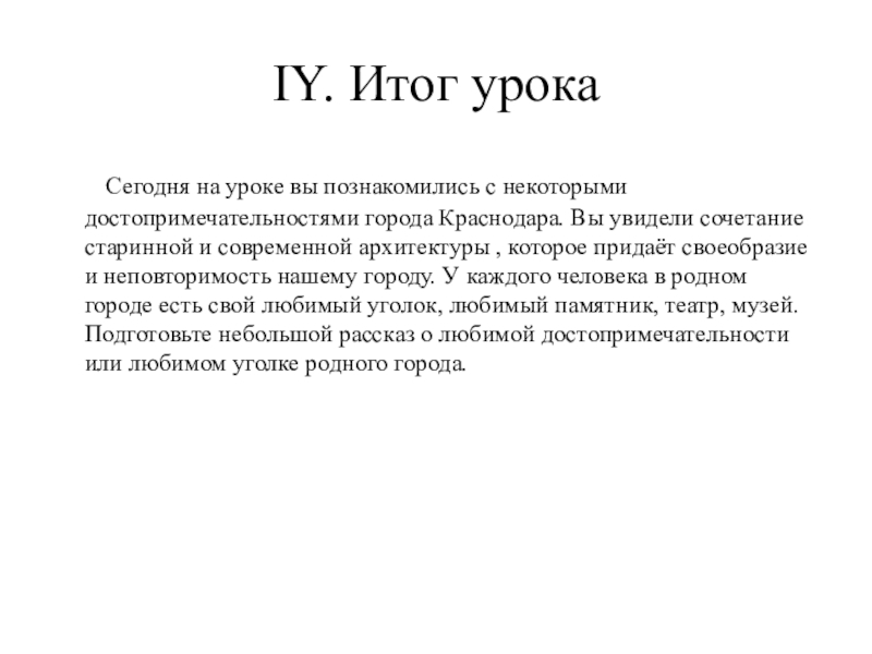 некоторыми достопримечательностями города Краснодара. Вы увидели сочетание старинной и современной архитектуры , которое придаёт своеобразие и неповторимость нашему городу. У каждого человека в родном городе есть свой любимый уголок, любимый памятник, театр, музей. Подготовьте небольшой рассказ о любимой достопримечательности или любимом уголке родного города.
