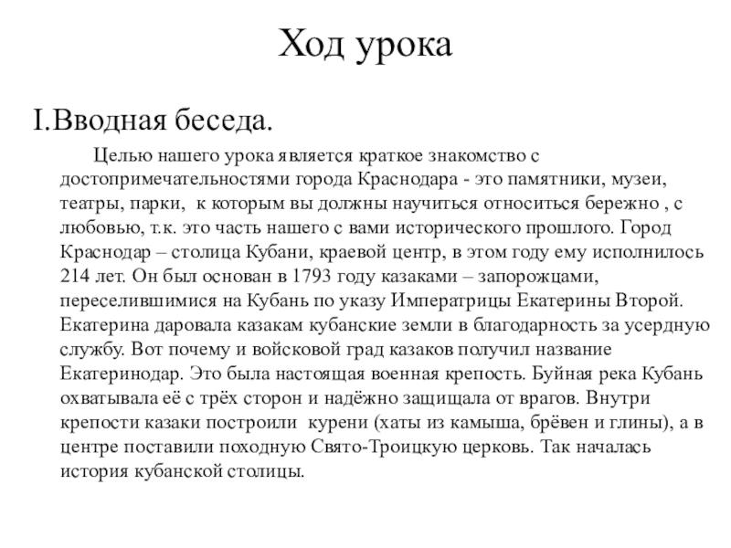 с достопримечательностями города Краснодара - это памятники, музеи, театры, парки, к которым вы должны научиться относиться бережно , с любовью, т.к. это часть нашего с вами исторического прошлого. Город Краснодар – столица Кубани, краевой центр, в этом году ему исполнилось 214 лет. Он был основан в 1793 году казаками – запорожцами, переселившимися на Кубань по указу Императрицы Екатерины Второй. Екатерина даровала казакам кубанские земли в благодарность за усердную службу. Вот почему и войсковой град казаков получил название Екатеринодар. Это была настоящая военная крепость. Буйная река Кубань охватывала её с трёх сторон и надёжно защищала от врагов. Внутри крепости казаки построили курени (хаты из камыша, брёвен и глины), а в центре поставили походную Свято-Троицкую церковь. Так началась история кубанской столицы.