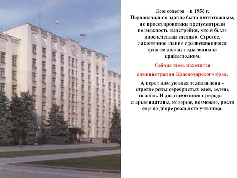 проектировщики предусмотрели возможность надстройки, что и было впоследствии сделано. Строгое, лаконичное здание с развевающимся флагом долгие годы занимал крайисполком.