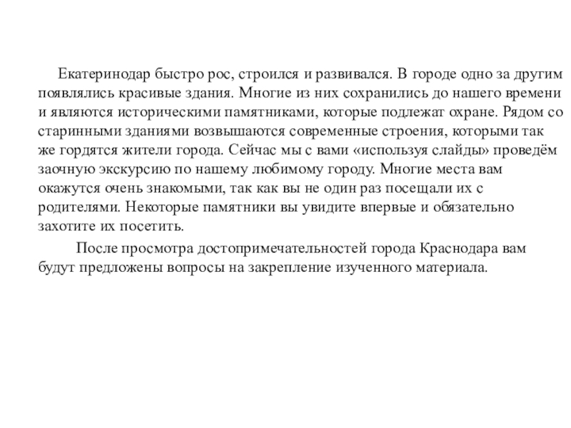 После просмотра достопримечательностей города Краснодара вам будут предложены вопросы на закрепление изученного материала.