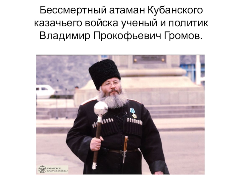 Слайд 12Бессмертный атаман Кубанского казачьего войска ученый и политик Владимир Прокофьевич Громов.