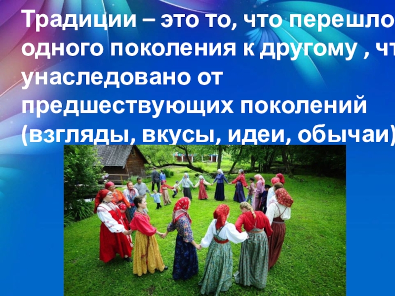 Слайд 4Традиции – это то, что перешло от одного поколения к другому