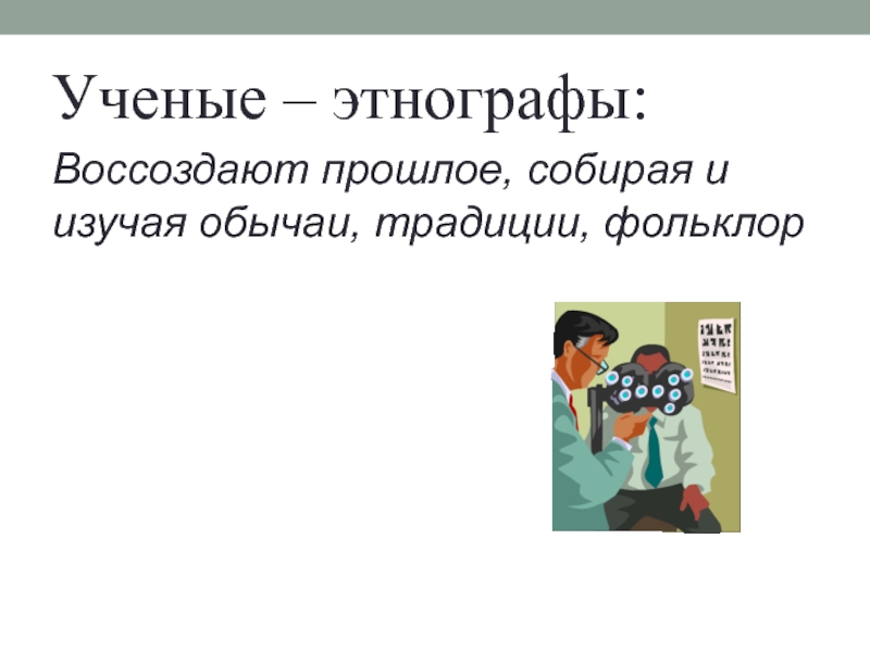 Ученые – этнографы:Воссоздают прошлое, собирая и изучая обычаи, традиции, фольклор