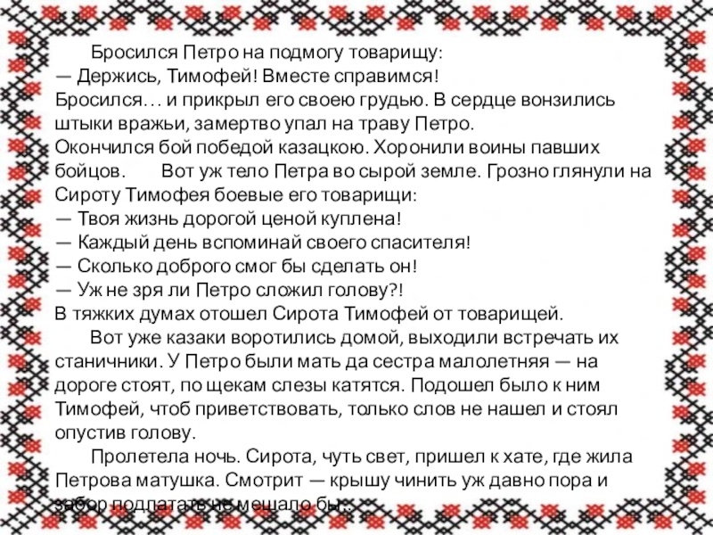 В страшной рубке Петро — молодец молодцом, быстро шашка сверкает острая. Только видит он: сразу трое врагов на Сироту Тимофея кинулись, одному не отбиться совсем от них, уж слабеет в Сироте казацкий дух.