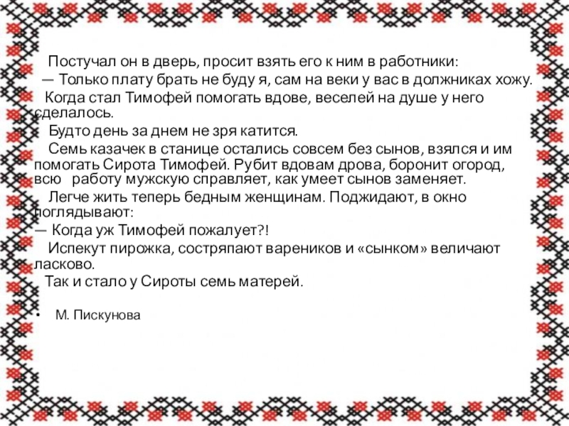 Семь казачек в станице остались совсем без сынов, взялся и им помогать Сирота Тимофей. Рубит вдовам дрова, боронит огород, всю работу мужскую справляет, как умеет сынов заменяет.