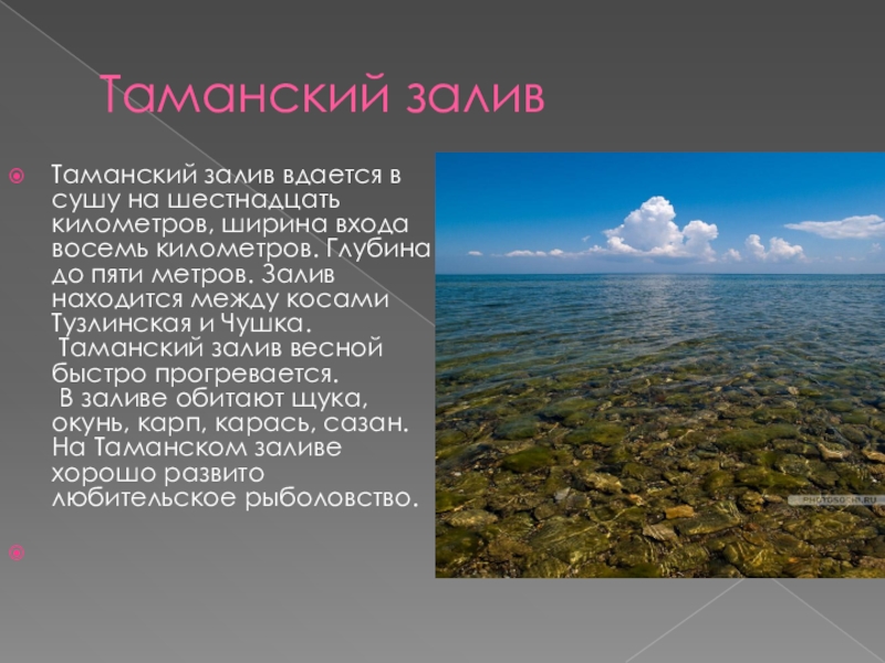 километров. Глубина до пяти метров. Залив находится между косами Тузлинская и Чушка.   Таманский залив весной быстро прогревается.  В заливе обитают щука, окунь, карп, карась, сазан.  На Таманском заливе хорошо развито любительское рыболовство.