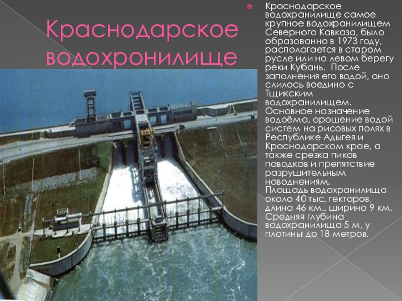 Краснодарское водохронилищеКраснодарское водохранилище самое крупное водохранилищем Северного Кавказа, было образованно в 1973 году,  располагается в старом русле