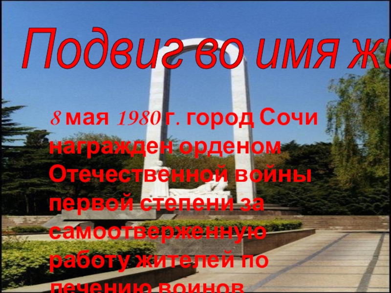 8 мая 1980 г. город Сочи награжден орденом Отечественной войны первой степени за самоотверженную работу жителей по лечению воинов Советской Армии.