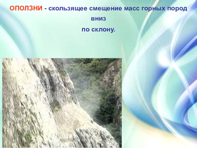Слайд 6ОПОЛЗНИ - скользящее смещение масс горных пород вниз