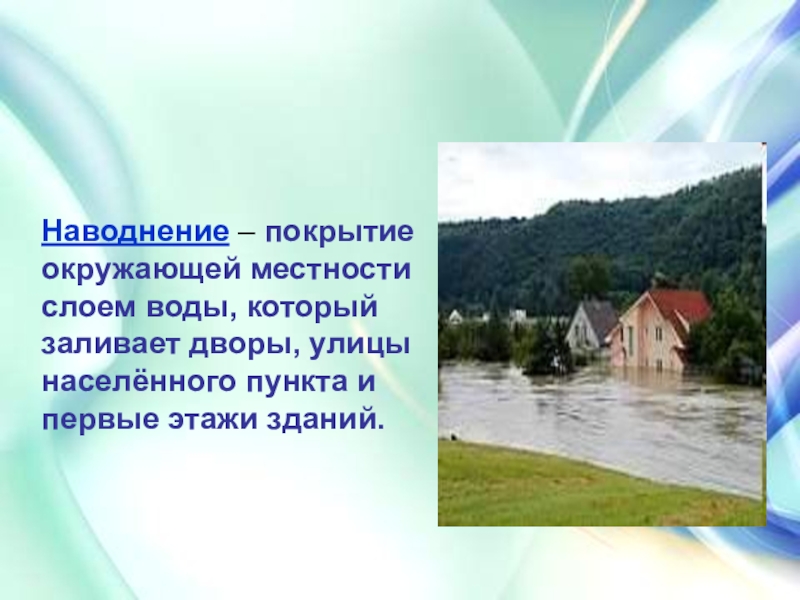 Слайд 3Наводнение – покрытие окружающей местности слоем воды, который заливает дворы, улицы
