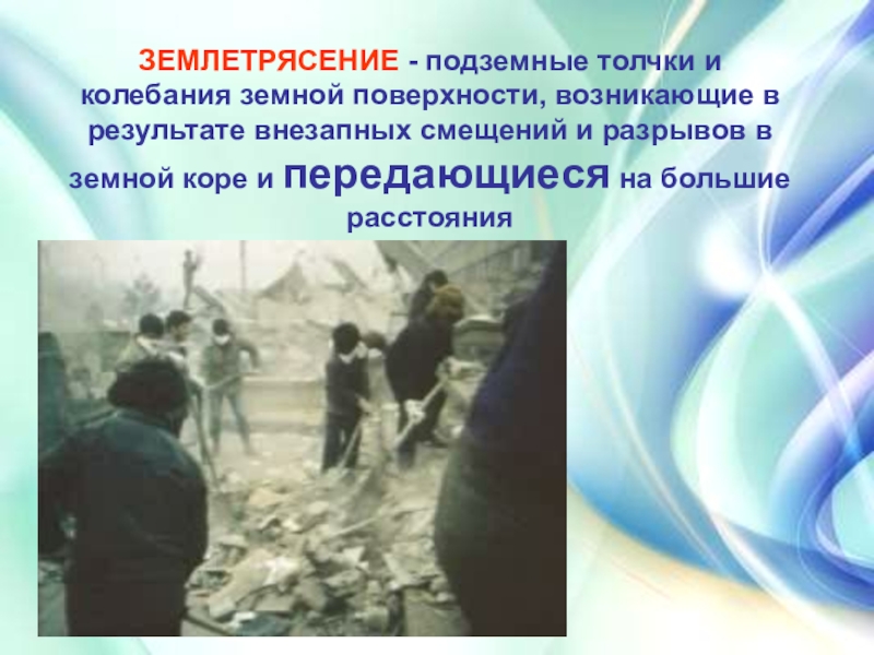 Слайд 5ЗЕМЛЕТРЯСЕНИЕ - подземные толчки и колебания земной поверхности, возникающие в результате