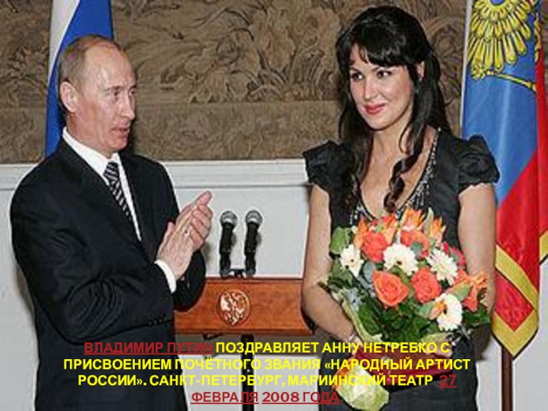 Владимир Путин поздравляет Анну Нетребко с присвоением почётного звания «Народный артист России». Санкт-Петербург, Мариинский театр. 27 февраля 2008 года.