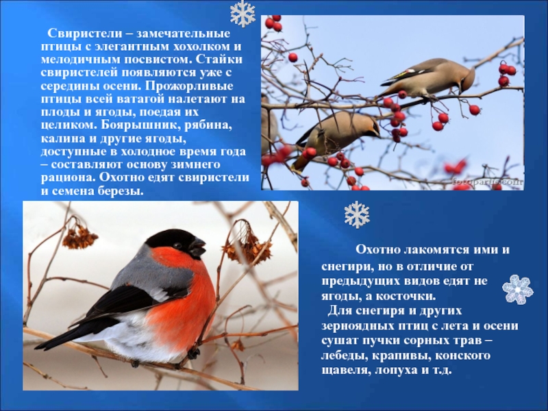 Охотно лакомятся ими и снегири, но в отличие от предыдущих видов едят не ягоды, а косточки.