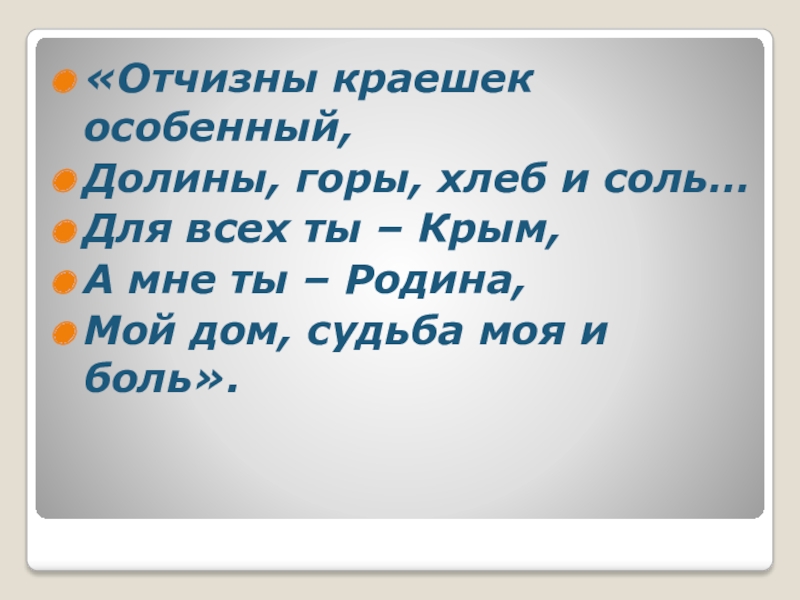 «Отчизны краешек особенный,Долины, горы, хлеб и соль…Для всех ты – Крым,А мне ты – Родина,Мой дом, судьба моя и боль».