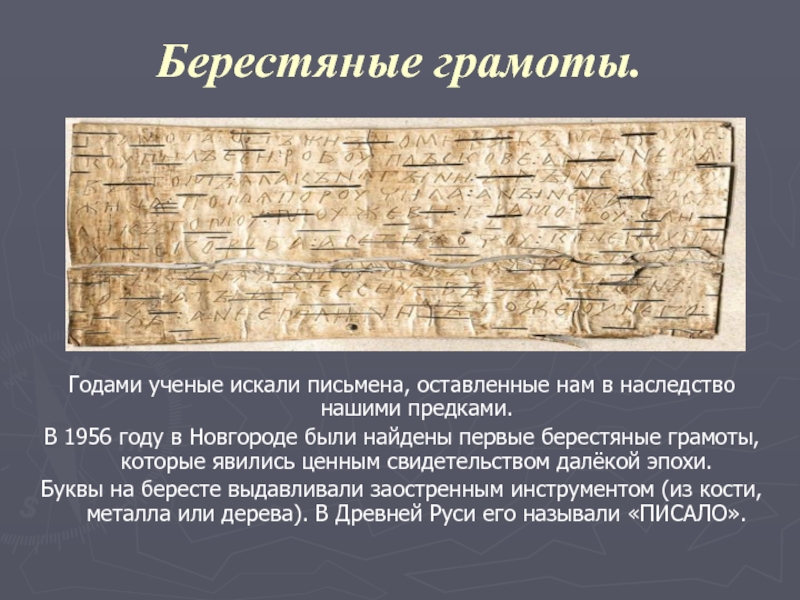 Берестяные грамоты.Годами ученые искали письмена, оставленные нам в наследство нашими предками.В 1956 году в Новгороде были найдены