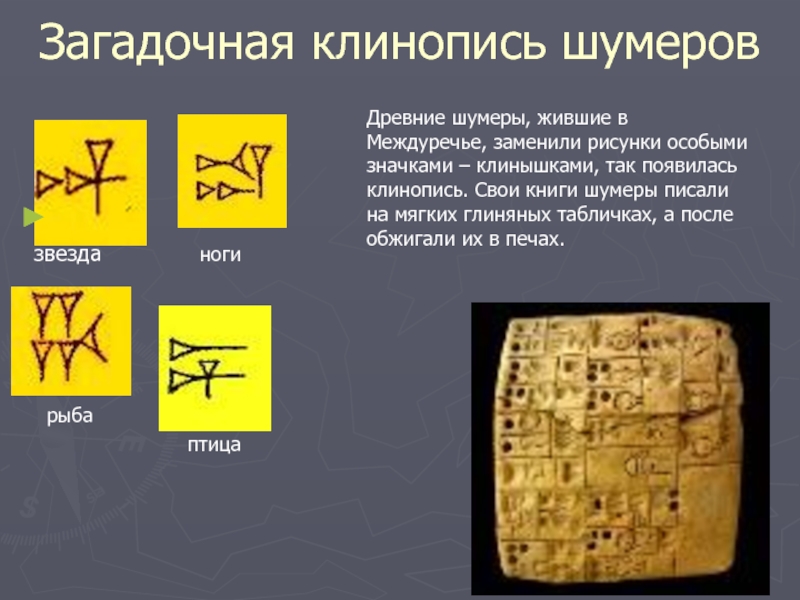 Загадочная клинопись шумеров        звезданогирыбаптицаДревние шумеры, жившие в Междуречье, заменили рисунки
