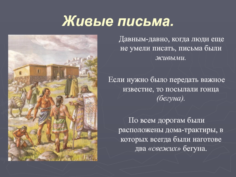 Живые письма.  Давным-давно, когда люди еще не умели писать, письма были живыми. Если нужно было передать