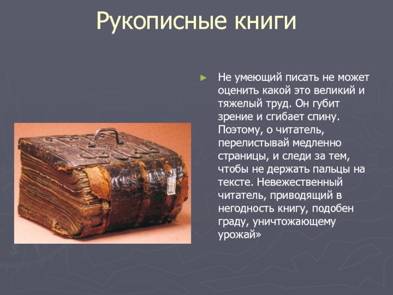 тяжелый труд. Он губит зрение и сгибает спину. Поэтому, о читатель, перелистывай медленно страницы, и следи за тем, чтобы не держать пальцы на тексте. Невежественный читатель, приводящий в негодность книгу, подобен граду, уничтожающему урожай»
