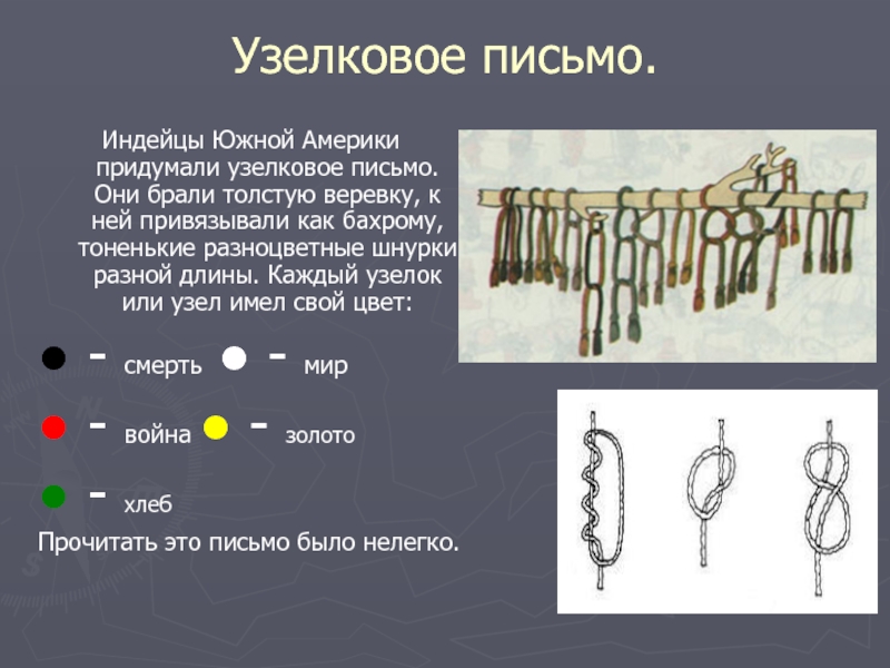 Узелковое письмо.Индейцы Южной Америки придумали узелковое письмо. Они брали толстую веревку, к ней привязывали как бахрому, тоненькие
