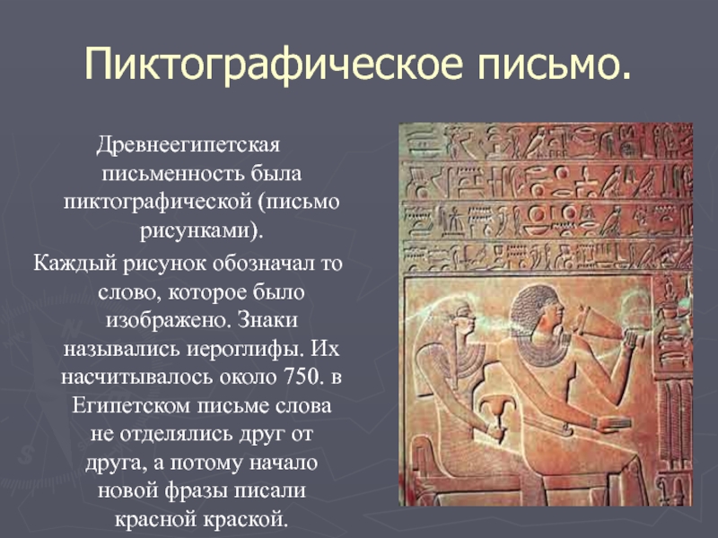 Пиктографическое письмо.Древнеегипетская письменность была пиктографической (письмо рисунками).Каждый рисунок обозначал то слово, которое было изображено. Знаки назывались иероглифы.