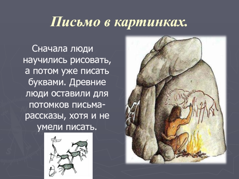 Письмо в картинках.Сначала люди научились рисовать, а потом уже писать буквами. Древние люди оставили для потомков письма-рассказы, хотя и не умели писать.