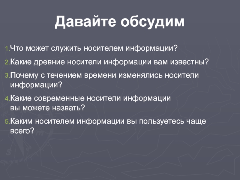 Давайте обсудимЧто может служить носителем информации?Какие древние носители информации вам известны?Почему с течением времени изменялись носители информации?Какие