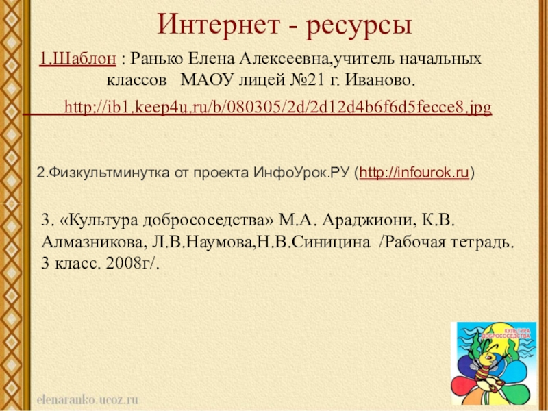 3. «Культура добрососедства» М.А. Араджиони, К.В.Алмазникова, Л.В.Наумова,Н.В.Синицина /Рабочая тетрадь. 3 класс. 2008г/.