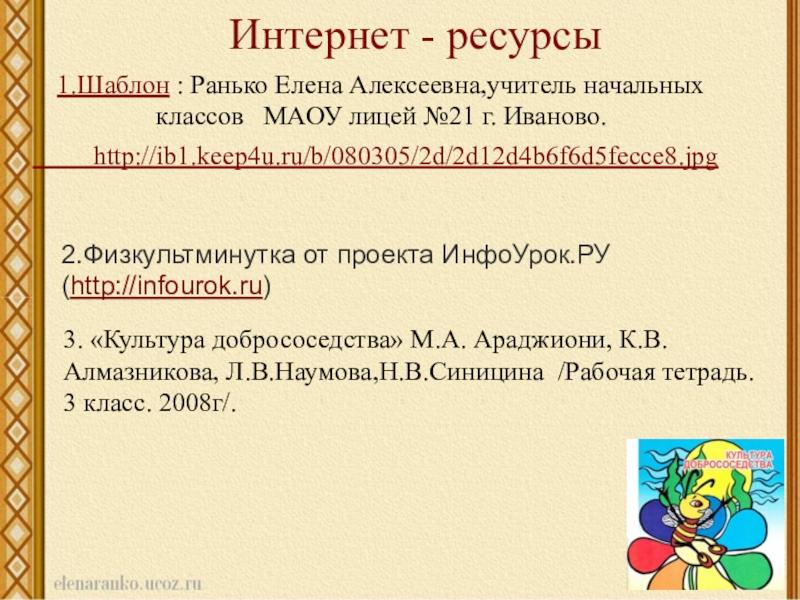 3. «Культура добрососедства» М.А. Араджиони, К.В.Алмазникова, Л.В.Наумова,Н.В.Синицина /Рабочая тетрадь. 3 класс. 2008г/.