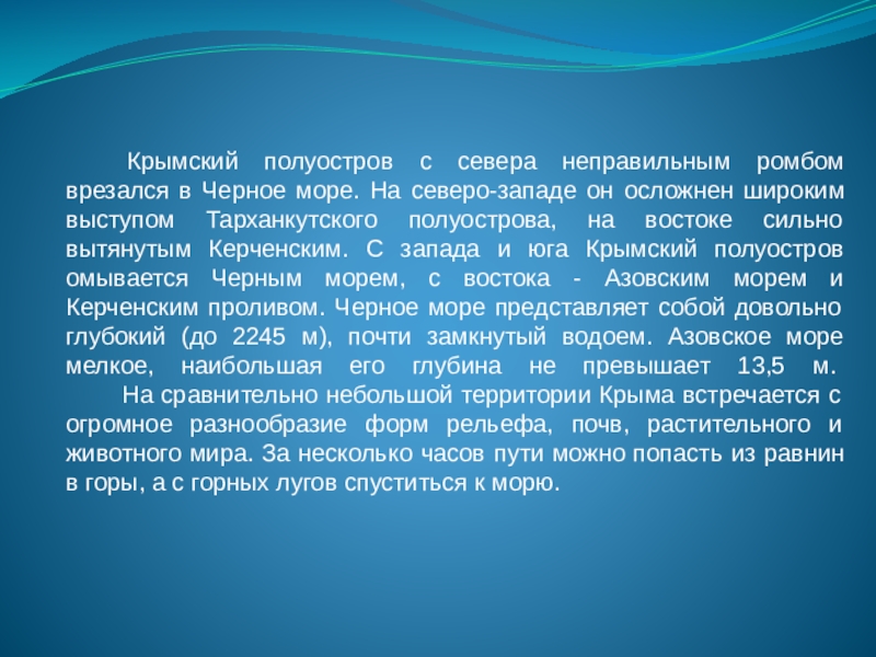 северо-западе он осложнен широким выступом Тарханкутского полуострова, на востоке сильно вытянутым Керченским. С запада и юга Крымский полуостров омывается Черным морем, с востока - Азовским морем и Керченским проливом. Черное море представляет собой довольно глубокий (до 2245 м), почти замкнутый водоем. Азовское море мелкое, наибольшая его глубина не превышает 13,5 м.  На сравнительно небольшой территории Крыма встречается с огромное разнообразие форм рельефа, почв, растительного и животного мира. За несколько часов пути можно попасть из равнин в горы, а с горных лугов спуститься к морю.