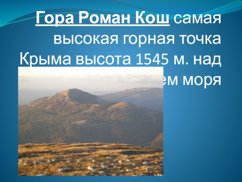 Слайд 20Гора Роман Кош самая высокая горная точка Крыма высота 1545 м. над уровнем моря