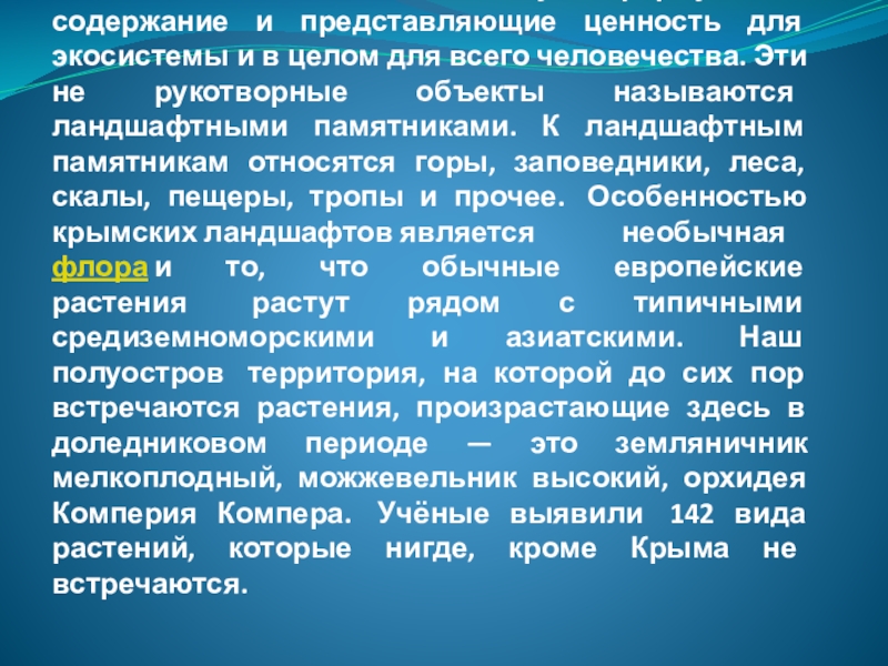 содержание и представляющие ценность для экосистемы и в целом для всего человечества. Эти не рукотворные объекты называются ландшафтными памятниками. К ландшафтным памятникам относятся горы, заповедники, леса, скалы, пещеры, тропы и прочее.  Особенностью крымских ландшафтов является необычная флора и то, что обычные европейские растения  растут рядом с типичными средиземноморскими и азиатскими. Наш полуостров  территория, на которой до сих пор встречаются растения, произрастающие здесь в доледниковом периоде — это земляничник мелкоплодный, можжевельник высокий, орхидея Комперия Компера.  Учёные выявили  142 вида растений, которые нигде, кроме Крыма не встречаются.