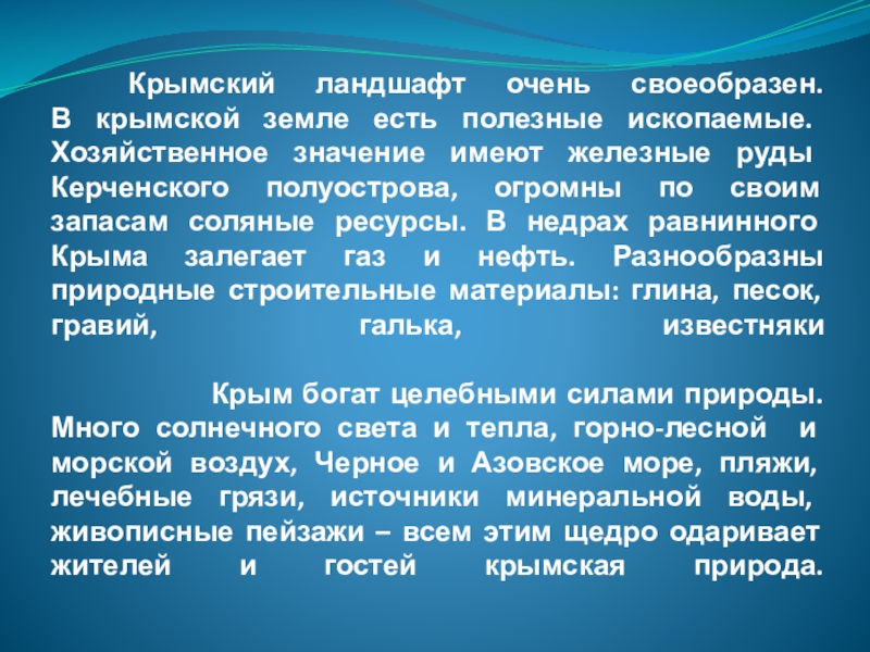 имеют железные руды Керченского полуострова, огромны по своим запасам соляные ресурсы. В недрах равнинного Крыма залегает газ и нефть. Разнообразны природные строительные материалы: глина, песок, гравий, галька, известняки Крым богат целебными силами природы. Много солнечного света и тепла, горно-лесной и морской воздух, Черное и Азовское море, пляжи, лечебные грязи, источники минеральной воды, живописные пейзажи – всем этим щедро одаривает жителей и гостей крымская природа.