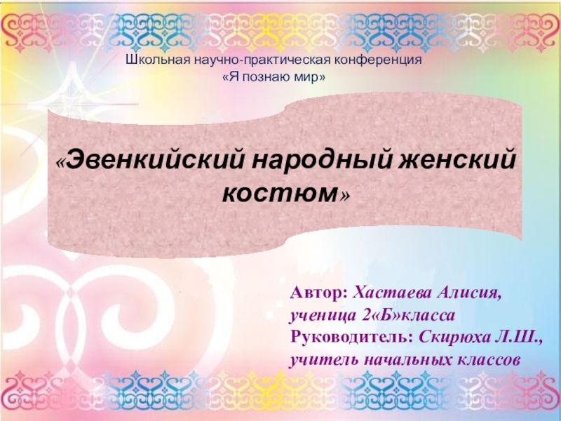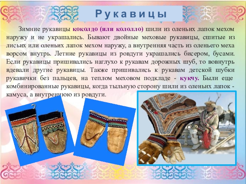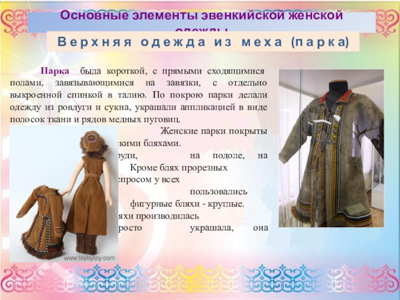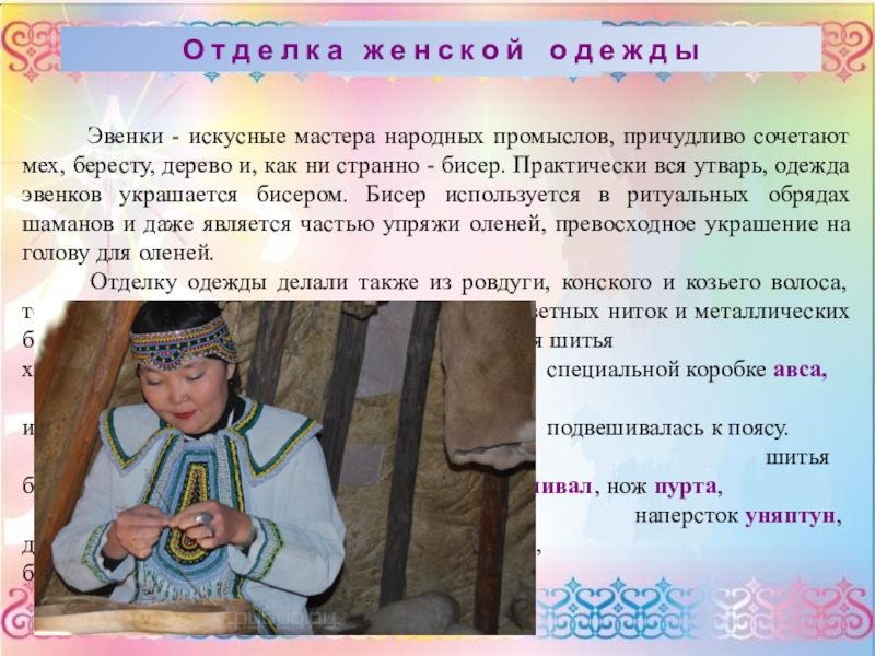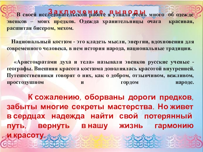 В своей исследовательской работе я узнала очень много об одежде эвенков – моих предков. Одежда хранительницы очага красивая, расшитая бисером, мехом.