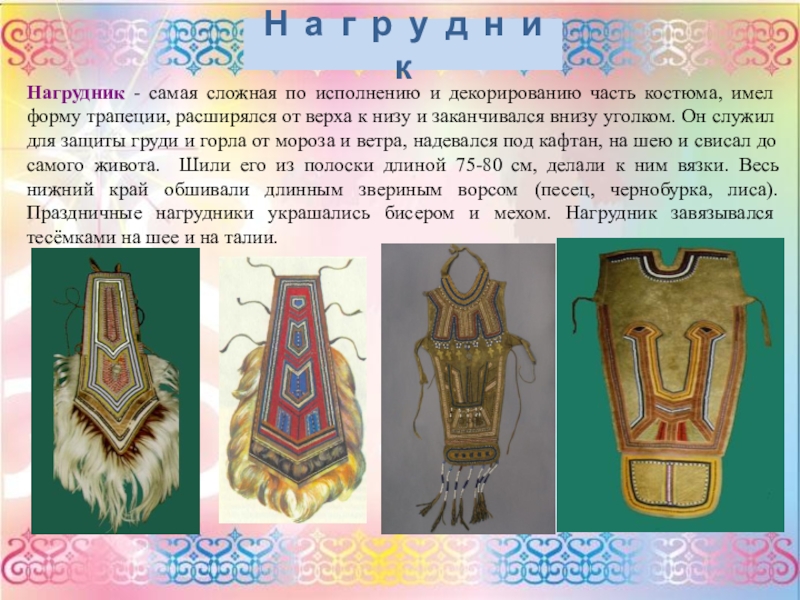 Основной особенностью костюма является его составность: кафтан, нагрудник, подвешенный на шею, натазник, ноговицы и унты.