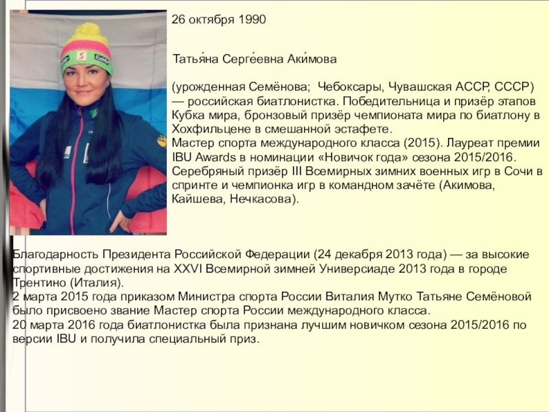 20 марта 2016 года биатлонистка была признана лучшим новичком сезона 2015/2016 по версии IBU и получила специальный приз.