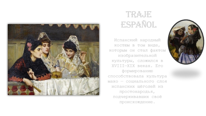 Traje españolИспанский народный костюм в том виде, которым он стал фактом изобразительной культуры, сложился в XVIII—XIX веках.