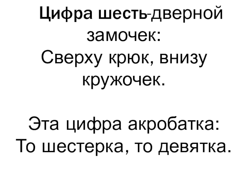 Цифра шесть-дверной   замочек: Сверху крюк, внизу кружочек.Эта цифра акробатка: То шестерка, то девятка.