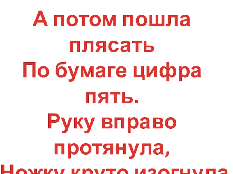 А потом пошла плясатьПо бумаге цифра пять.Руку вправо протянула, Ножку круто изогнула