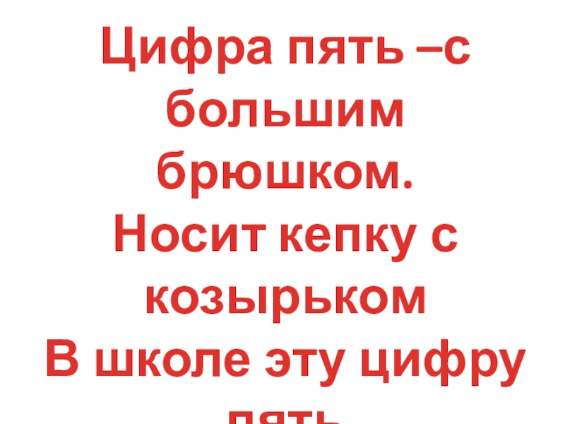 Цифра пять –с большим брюшком.Носит кепку с козырькомВ школе эту цифру пятьДети любят получать