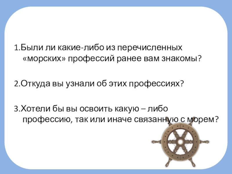 Слайд 271.Были ли какие-либо из перечисленных «морских» профессий ранее вам знакомы?