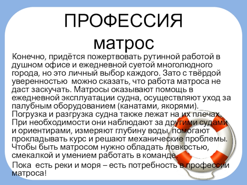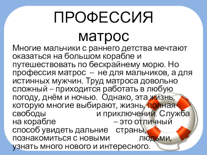путешествовать по бескрайнему морю. Но профессия матрос – не для мальчиков, а для истинных мужчин. Труд матроса довольно сложный – приходится работать в любую погоду, днём и ночью. Однако, эта жизнь, которую многие выбирают, жизнь, полная свободы и приключений. Служба на корабле – это отличный способ увидеть дальние страны, познакомиться с новыми людьми, узнать много нового и интересного.