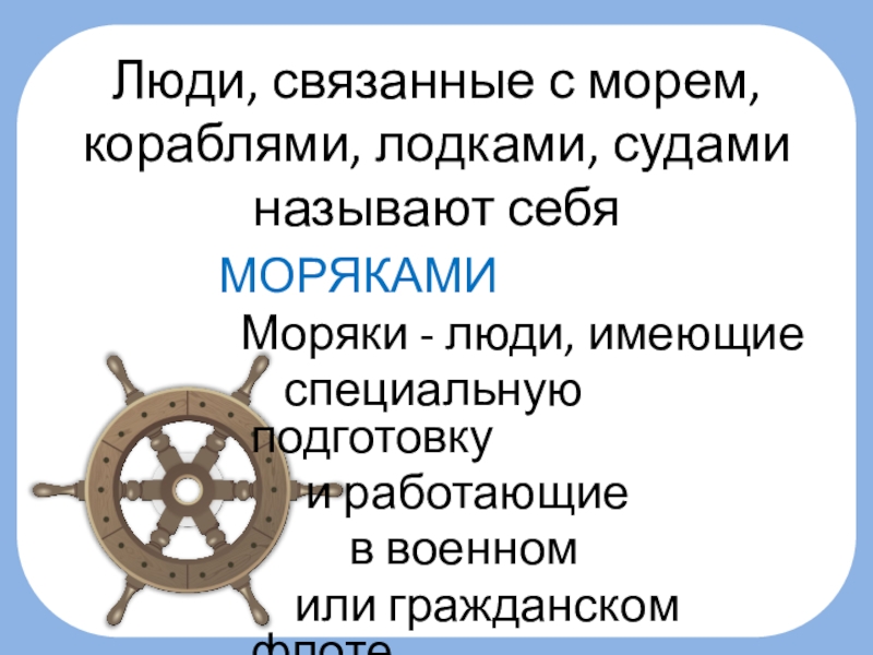 Слайд 5Люди, связанные с морем, кораблями, лодками, судами называют себя
